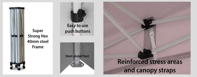 Designed for strength, space, and reliability, this 3m x 6m (10ft by 20ft) Steel Hex Pop Up Gazebo is built for commercial and event use. Featuring a reinforced 40mm hexagonal steel frame and 420D Oxford PVC coated waterproof canopy, it delivers dependable protection in Irish weather conditions.