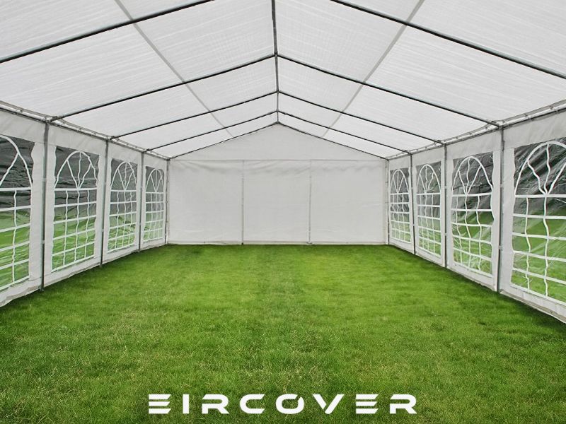 The PE Marquee PLUS offers a strong construction with a frame made of galvanised steel tubes locked with bolts in combination with a 100% waterproof Polyethylene cover. The Marquee is delivered with detachable sidewalls and end walls. The large Georgian-styled windows along the sides of the marquee provide a beautiful inflow of light.